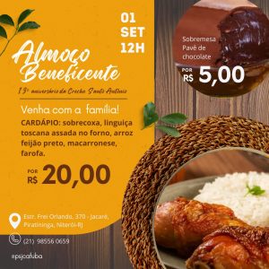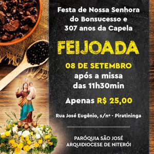 Dia 08/09 após Santa Missa – Almoço (Feijoada) – Valor 25,00 reais End.: Rua José