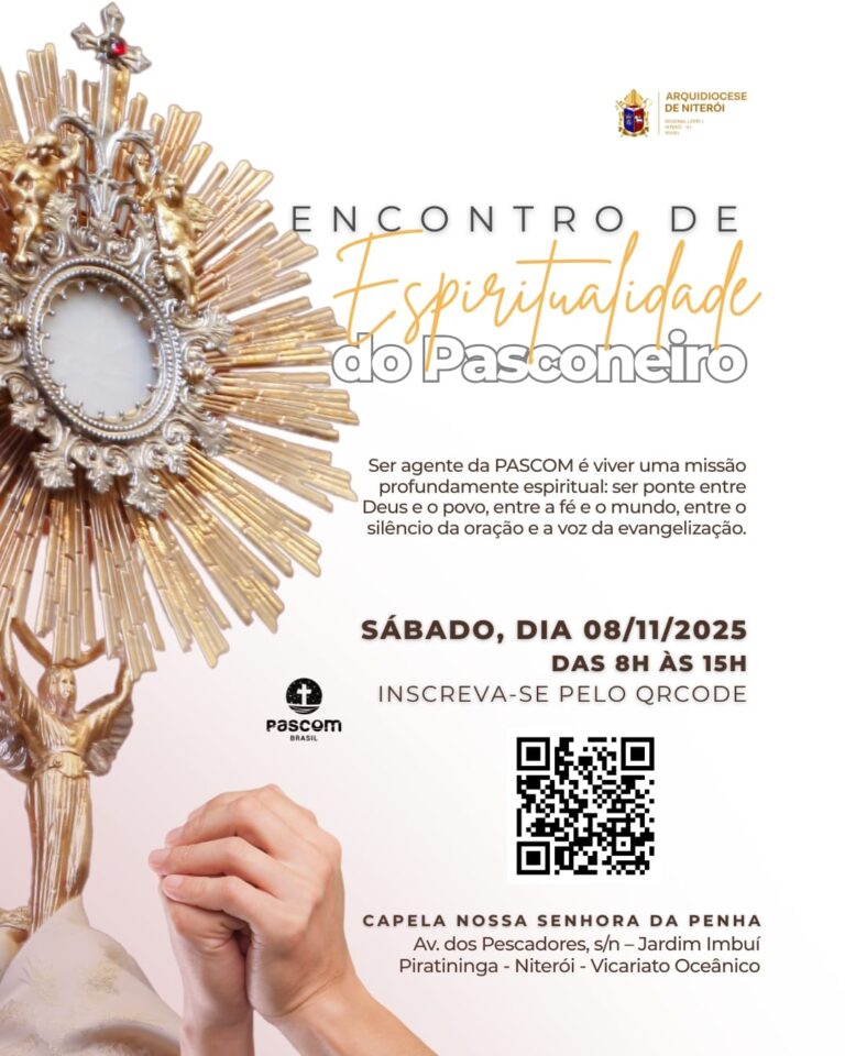 Convidamos TODOS os agentes para o nosso primeiro *Encontro de Espiritualidade das Pascom* , que tem como proposta proporcionar um momento de oração, reflexão e escuta interior, recordando que ser agente da Pascom é viver uma missão profundamente espiritual com os irmãos.