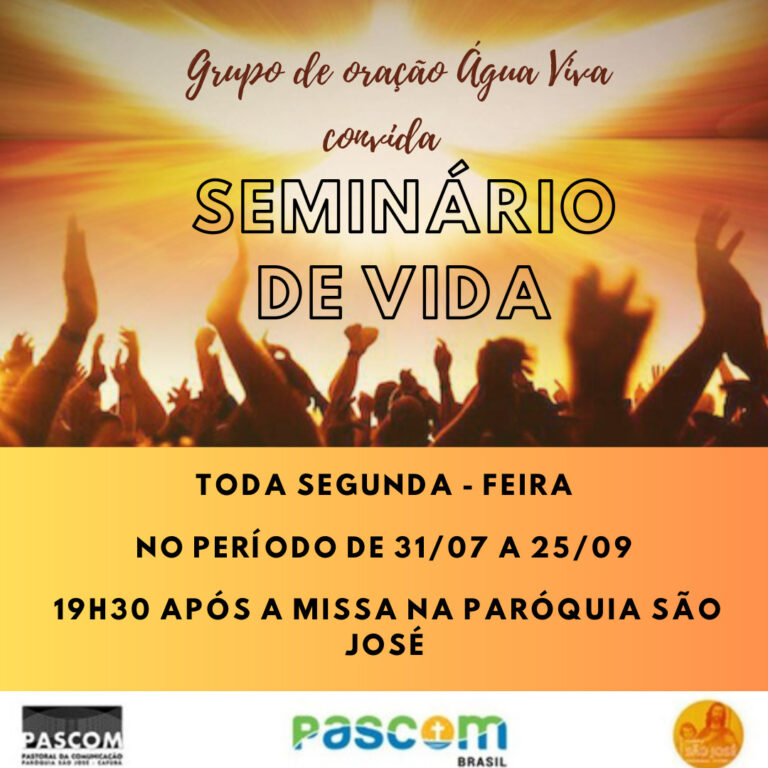 O grupo de oração Água Viva convida para participar do Seminário de Vida todas as segundas no período de 31/07 a 25/09, às 19h30 após a Missa na Paróquia São José.