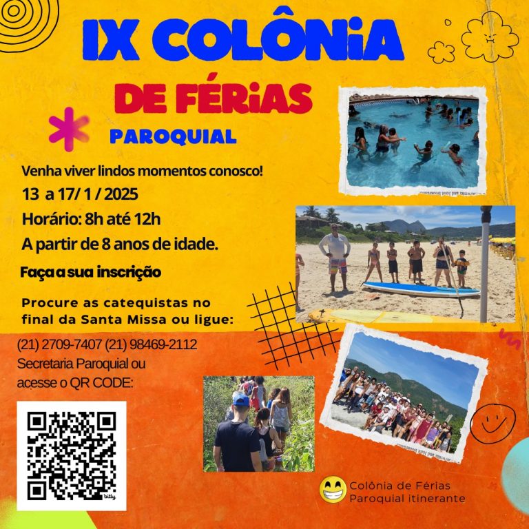 IX (NOVA) COLÔNIA DE FÉRIAS DA PARÓQUIA SÃO JOSÉ. Venha viver lindos momentos conosco! De 13 a 17/01/2025, de 8h às 12h. Para crianças a partir de 8 anos de idade, inscrições com as catequistas ao final das missas, na secretaria paroquial ou através do QR CODE nos murais da igreja.