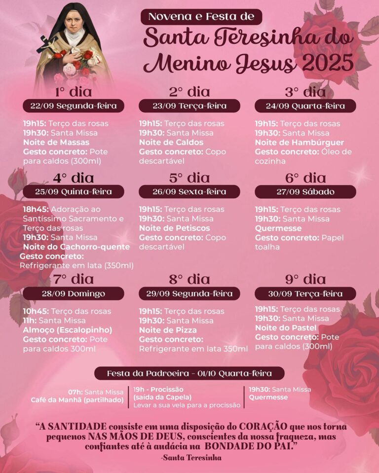 Com grande júbilo, convidamos a comunidade para a Novena e Festa em honra a Santa Teresinha do Menino Jesus.