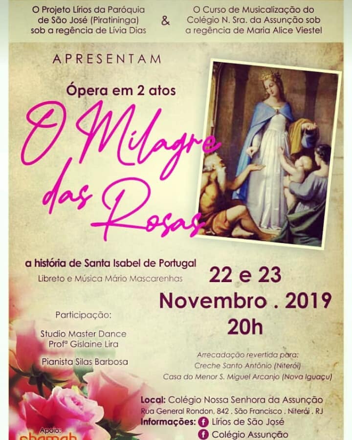 Aconteceu nos dias 22 e 23 de novembro – O Projeto Lírios da Paróquia de São José – Cafubá apresentou Ópera em 2 atos – O Milagre das Rosas a história da Santa Isabel de Portugal. A arrecadação foi revertida em prol da Creche Santo Antônio (Niterói) e Casa do Menor São Miguel Arcanjo (Nova Iguaçu). Agradecemos a presença de todos.