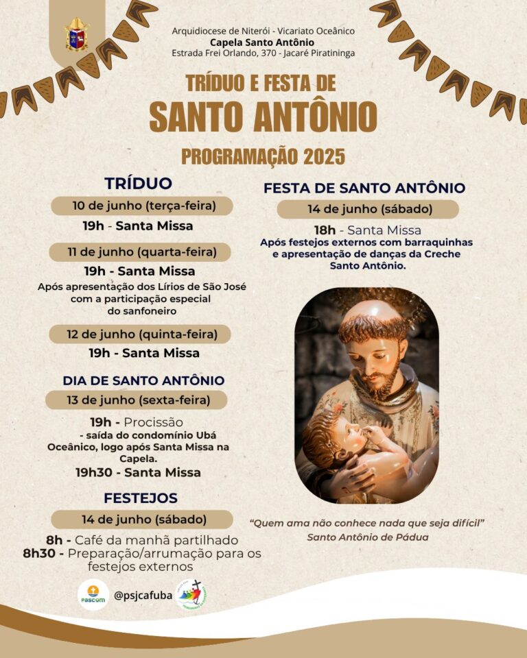 A comunidade está em festa! Venha participar conosco do Tríduo e da tradicional Festa de Santo Antônio!